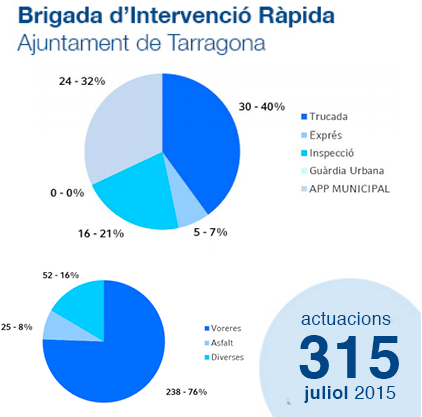 Durant el mes de juliol la Brigada d'Intervenció Ràpida ha dut a terme un total de 315 actuacions a tota la ciutat. La majoria d'aquestes intervencions s'han resolt sobre voreres.