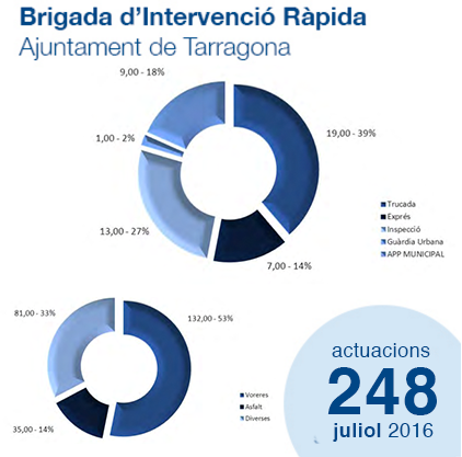 Durant el mes de juliol la Brigada d'Intervenció Ràpida ha dut a terme un total de 248 actuacions a tota la ciutat, tant el centre com els barris. La majoria d'aquestes intervencions s'han resolt sobre voreres.