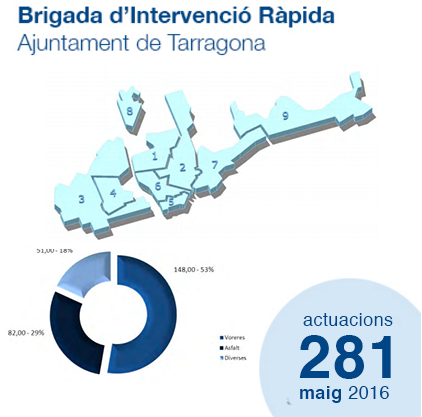 Durant el mes de maig la Brigada d'Intervenció Ràpida ha dut a terme un total de 281 actuacions a tota la ciutat, tant el centre com els barris. La majoria d'aquestes intervencions s'han resolt sobre voreres.