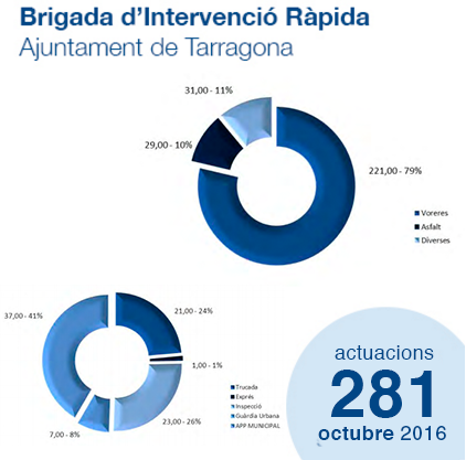 Durant el mes d‘octubre la Brigada d'Intervenció Ràpida ha dut a terme un total de 281 actuacions a tota la ciutat, tant el centre com els barris. La majoria d'aquestes intervencions s'han resolt sobre voreres.