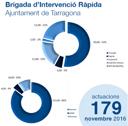 Durant el mes de novembre la Brigada d'Intervenció Ràpida ha dut a terme un total de 179 actuacions a tota la ciutat, tant al centre com als barris. La majoria d'aquestes intervencions s'han resolt sobre voreres.