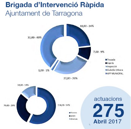 Durant el mes d'abril la Brigada d'Intervenció Ràpida ha dut a terme un total de 275 actuacions a tota la ciutat, tant al centre com als barris. La majoria d'aquestes intervencions s'han resolt sobre voreres.