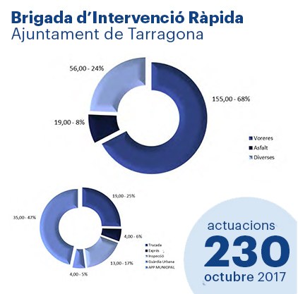 Durant el mes d'octubre de 2017 la Brigada d'Intervenció Ràpida ha dut a terme un total de 230 actuacions a tota la ciutat, tant al centre com als barris. La majoria d'aquestes intervencions s'han resolt sobre voreres.