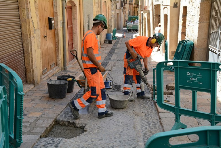 La Brigada d'Intervenció Ràpida repara el paviment de pedra artística del carrer Calderers