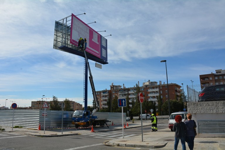 Per qüestions logístiques, avui s’ha tapat amb pintura una banda de la publicitat del tòtem i dimarts, es procedirà a l’altra.