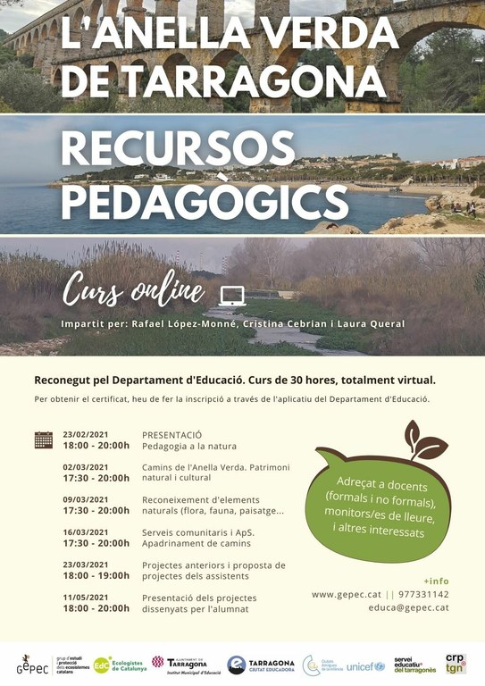 El passat 23 de febrer es va iniciar el curs de formació de professorat i formadors: L’anella Verda de Tarragona - Recursos pedagògics en format totalment virtual. Es tracta d’un curs impulsat per l’Ajuntament de Tarragona a través de l’Institut Municipal d’Educació de Tarragona (IMET), en el marc de les activitats de Ciutat Educadora, i està reconegut pel Departament d’Educació de la Generalitat de Catalunya, a través del Centre de Recursos Pedagògics del Tarragonès i coordinat pel GEPEC-EdC.