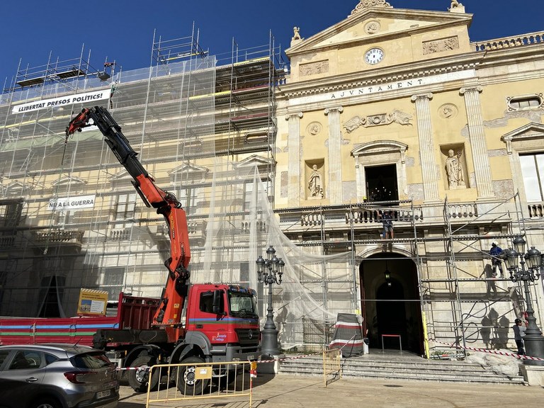 Continuen avançant les obres de rehabilitació de la coberta i les balustrades del Palau Municipal. Aquests dies s’està desmuntant la part de la bastida de l’entrada principal i una part de la bastida del Saló de Plens. Durant aquests mesos s’ha restaurat la balustrada i els elements escultòrics d’aquesta part de l’edifici. Ara es continuarà amb les tasques de restauració de la coberta.
