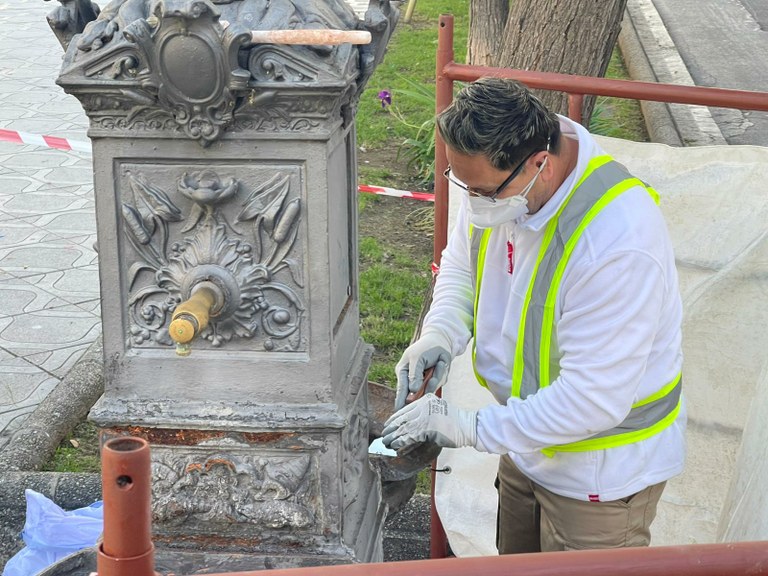 Un cop fet això, el personal tècnic de la Brigada treballa en les parts rovellades de les fonts i apliquen el tractament anticorrosiu així com preparen la superfície metàl·lica, per procedir posteriorment al seu repintat. Finalment, s’aplica a les fonts de manera manual la pintura antioxidant per, posteriorment netejar i polir les aixetes de llautó.