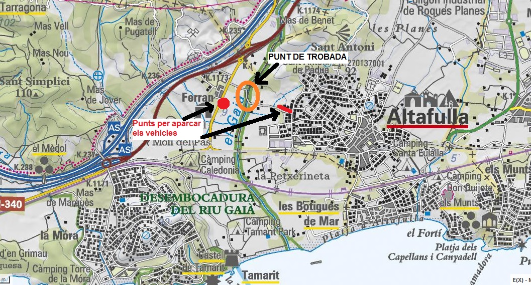 Es pot aparcar en els dos punts marcats al plànol, davant de Ferran i a Altafulla, al carrer camí de Ferran. Hi ha cinc minuts caminant al punt de trobada.