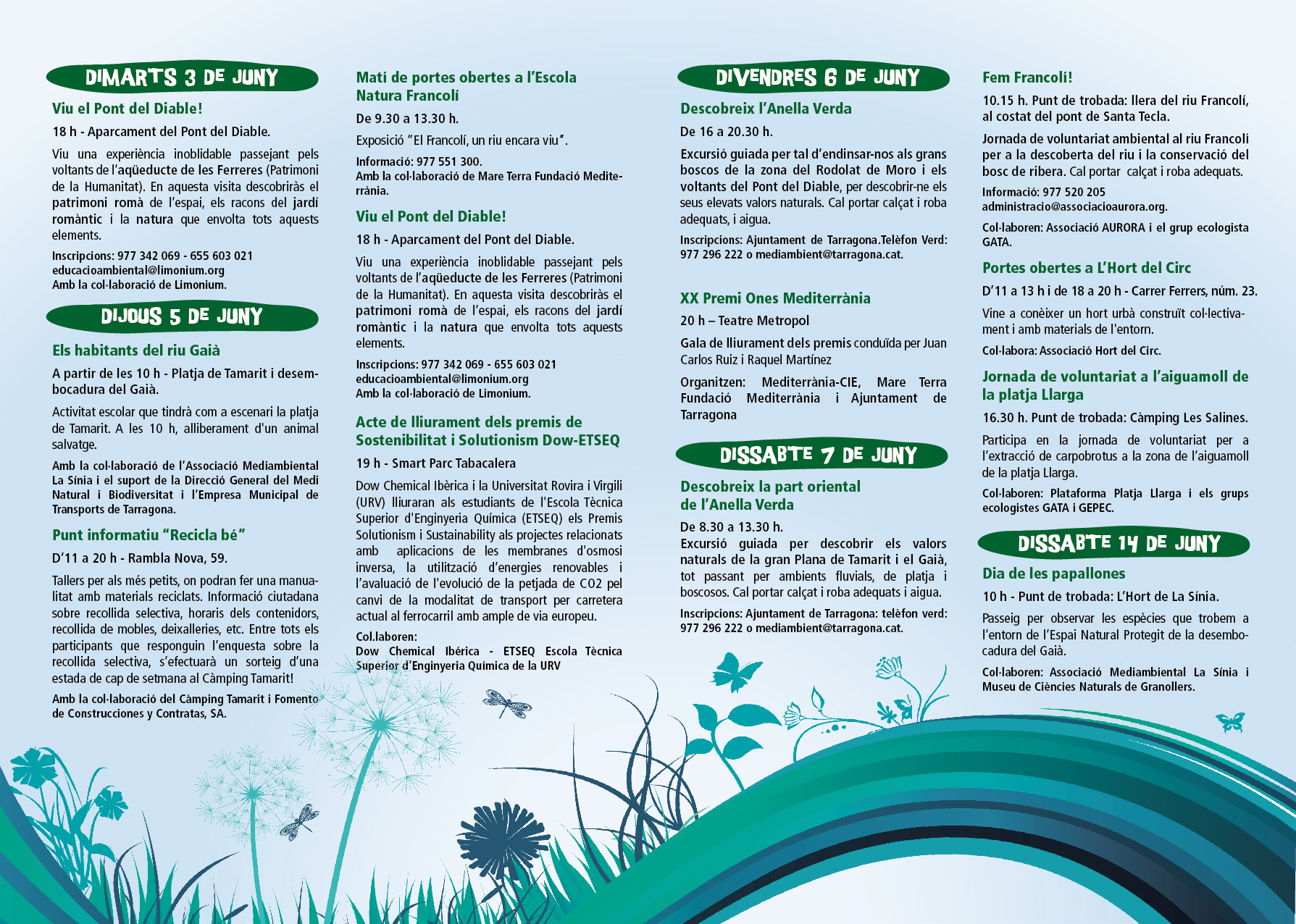 Amb motiu del Dia Mundial del Medi Ambient, que és el dia 5 de juny, l’Ajuntament de Tarragona, en col·laboració amb diverses entitats i empreses, ha organitzat i coordinat una sèrie d’activitats que conformen un important programa entorn de la natura, el respecte i la sensibilització pel medi natural.