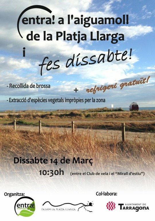 La Cooperativa Entra! i la Plataforma Platja Llarga, amb la col·laboració de l’Ajuntament de Tarragona, organitzen una jornada de voluntariat per al manteniment d'un aiguamoll situat entre el Club de Vela i el restaurant Mirall d’estiu de la platja Llarga de Tarragona.