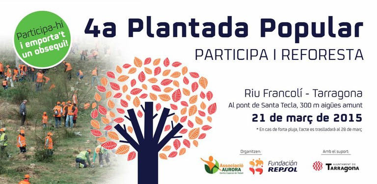 La Fundación Repsol i l’Associació Aurora, amb el suport del Departament de Medi Ambient de l’Ajuntament de Tarragona, organitzen la 4a Plantada Popular al riu Francolí, a 300 m aigües amunt del pont de Santa Tecla. Atesa la forta pluja de dissabte, la jornada s'ha traslladat al pròxim 28 de març.
