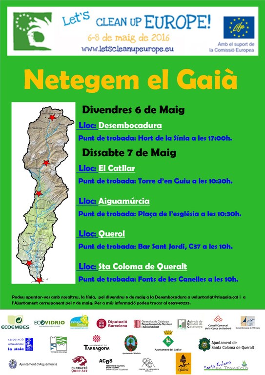 Els dies 6 i 7 de maig, Tarragona s'afegeix al Let's Clean Up Europe amb la campanya "Netegem el Gaià". L'activitat, organitzada per l'Associació Mediambiental La Sínia i l'àrea de Medi Ambient de l'Ajuntament, proposa diferents punts de trobada al llarg del riu Gaià per netejar i retirar-ne els residus abocats il·legalment.