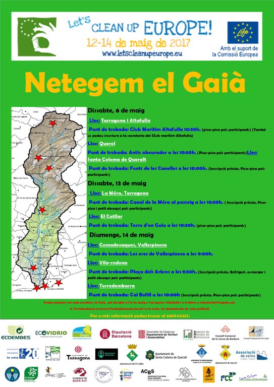 El dies 6, 13 i 14 de maig, Tarragona s’afegeix al Let’s Clean Up Europe amb la campanya “Netegem el Gaià”. L’activitat, organitzada per l’Associació Mediambiental La Sínia i l’àrea de Medi Ambient de l’Ajuntament, proposa diferents punts de trobada al llarg del riu Gaià per netejar i retirar-ne els residus abocats il·legalment (vegeu el mapa de l'acció i la informació més detallada ampliant el cartell).