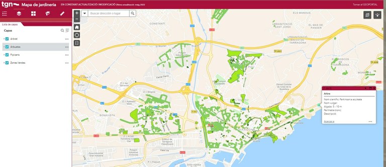 En total, Tarragona compta amb més de 150 zones verdes, de les quals, una seixantena es troben als barris de Ponent, una trentena als de Llevant, i la resta al centre. Al mapa interactiu hi apareixen de manera detallada, a més de la localització exacta dels espais verds i pipi cans de la ciutat, les 49 espècies catalogades i es poden consultar les 293 fitxes actualitzades de cada exemplar. Les espècies amb més representació a la ciutat son el Plàtan de carrer; el Pi Blanc; el Margalló; la Palmera de ventall; el Pi pinyer; l’Alzina i la Palmera datilera, entre d’altres.