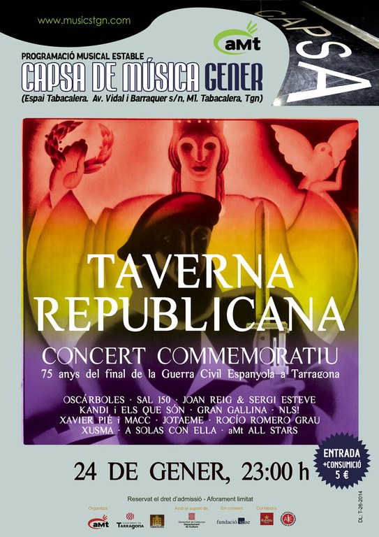 El divendres 24 de gener a partir de les 23h a la Capsa de Música, serà el torn de l’Associació de Músics de Tarragona (aMt) que col·laboren amb aquest extens programa, presentant un concert que sota el títol Taverna Republicana, vol fer un repàs de les principals cançons que al llarg de la història han rememorat fets de la guerra civil.