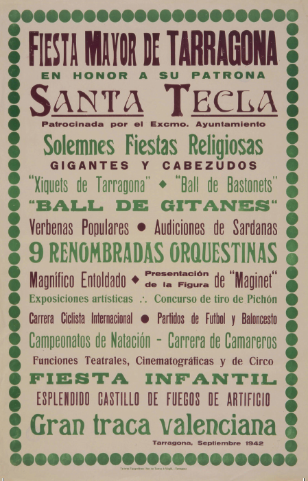 El disseny dels cartells de les festes de Santa Tecla ha evolucionat al llarg dels anys i reflecteix els canvis registrats en la societat de cada època. En aquesta exposició mostrem la imatge de les festes entre 1942 i 1977, és a dir, des dels inicis del règim franquista fins als primers anys de la transició democràtica. Els cartells editats als anys quaranta i cinquanta son de formats similars i amb detalls d’estètica franquista. Mentre que durant els anys seixanta i setanta, a banda d’un disseny més modern, l’interès en potenciar les festes de Sant Magí com a reclam turístic va portar a que s’anunciessin conjuntament Sant Magí i Santa Tecla, fent-se càrrec de l’edició dels cartells les empreses de publicitat.
