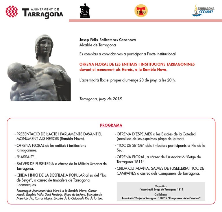 Aquest diumenge, 28 de juny, data de l'assalt les tropes franceses a la ciutat, a les vuit del vespre, es farà l’acte final de la commemoració dels fets, amb l’ofrena floral de les entitats i institucions tarragonines davant el Monument als Herois, a la Rambla Nova, obra de l’escultor Julio Antonio. Després de l’ofrena la comitiva seguirà la tamborinada popular amb les espelmes enceses, fins el Pla de la Seu, es dipositaran les espelmes a les escales de la catedral i es guardarà un minut de silenci per recordar el saqueig de la ciutat.