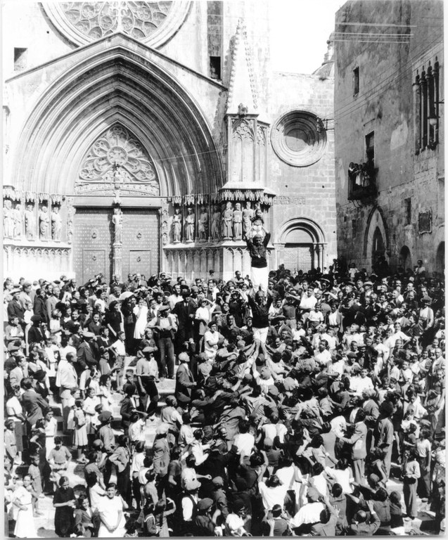 • Pilar de cinc dels Xiquets de Tarragona davant la façana de l’Ajuntament de Tarragona. Foto Vallvé, 24 de setembre de 1939. Centre d’Imatges de Tarragona / L’Arxiu.