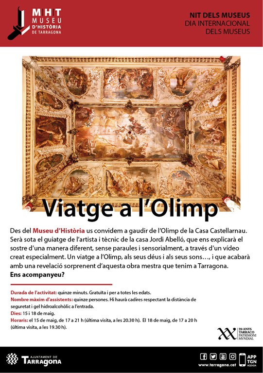 La primera proposta s’oferirà des del Museu d’Història de Tarragona i farem un Viatge a l’Olimp, contemplant les obres pictòriques d'una de les sales de la Casa Castellarnau. L'artista i tècnic municipal, Jordi Abelló, ens explicarà el sostre d’una manera diferent, sense paraules, sensorialment, a través d’un vídeo creat expressament. Un viatge a l’Olimp, als seus déus i als seus sons i que acabarà amb una revelació sorprenent d’aquesta obra mestra de Tarragona. Aquest passeig sensorial es podrà fer dos dies, el dissabte 15 i el dimarts 18 de maig, durant tota la tarda.