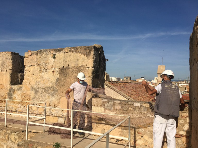 Aquest dilluns s’estan duent a terme els treballs d’instal·lació d’una xarxa a la cantonada nord-est de la torre del Pretori. Es tracta d’una actuació derivada dels treballs d’inspecció realitzats fa unes setmanes i tenen per objectiu eliminar el perill de possibles despreniments a la via pública.