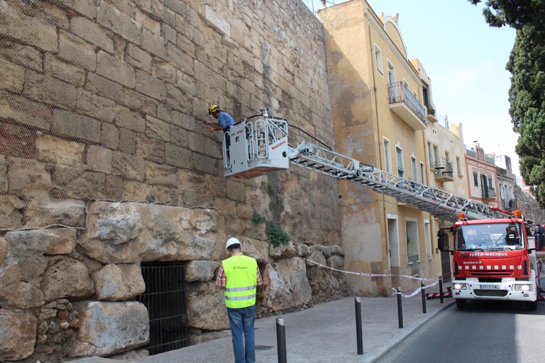 Malauradament aquesta actuació ha provocat aquest efecte col·lateral indesitjat, com és l’atrapament i mort d’alguns exemplars de falciot. Per tal de resoldre aquesta i per tal d’establir al comptabilització de la conservació del patrimoni històric, avui s’ha dut a terme aquesta intervenció amb la col·laboració d’un vehicle escala dels Bombers de la Generalitat, aquest dijous i s’ha procedit a realitzar petites obertures a la xarxa a l’alçada dels nius de falciot per tal d’evitar nous atrapaments, buscant sempre la comptabilització de la conservació del patrimoni històric, la seguretat de les persones i la integritat dels falciots. Fruit d’aquesta tasca conjunta s’ha realitzat un inventari de nius de falciot a la muralla de Tarragona, amb el resultat de 128 nius inventariats.