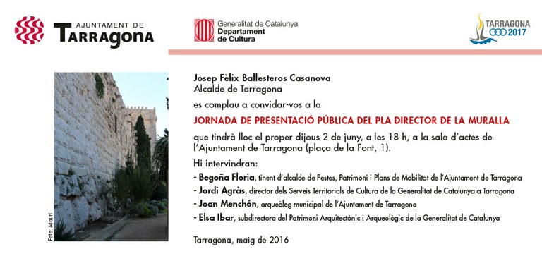 El proper dijous 2 de juny (18 h) tindrà lloc a la sala d'actes de l'Ajuntament la presentació pública del Pla Director de la Muralla, en una jornada organitzada per la conselleria de Patrimoni Històric de l'Ajuntament de Tarragona i la direcció general d’Arxius, Biblioteques, Museus i Patrimoni de la Generalitat de Catalunya, impulsors del projecte.