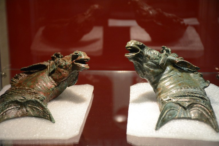 Aquests elements formaven part d’un llit, concretament d’un lectus tricliniaris, un llit emprat en els fastuosos banquets dels romans. L’estructura portant en fusta d’aquests llits es caracteritzava per un o dos respatllers als extrems en forma de coixí ondulat, denominats fulcra i una armadura rectangular formada per travessers de fusta connectats a una graella de llistons o tires de cuir que sustentaven el matalàs i els coixins. Al seu torn, les quatre potes anaven acoblades als quatre travessers del llit. La decoració d’aquests fulcra era acurada i seguia la silueta del respatller amb una estructura de bronze, d’on corresponen aquests caps de cavall, que formarien part d’una peça més gran, que no s’ha conservat.