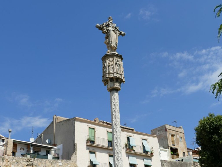 La creu de Sant Antoni és del segle XVII, realitzada el 1604, en substitució d’una anterior. L’actual és d’estil barroc de 9 metres d’alçada i està tallada amb pedra calcària del país. La base i la columna presenten decoracions i el capitell està decorat amb les figures de Santa Tecla, Sant Josep, Sant Antoni, Sant Fructuós, Santa Llúcia, Sant Magí i Sant Pere i Sant Pau. Al capdamunt hi ha la figura del Sant Crist i de la Verge Maria.