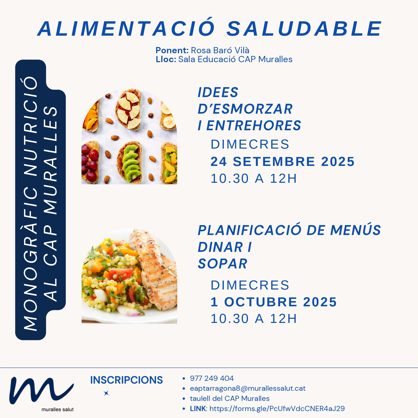 Inscripcions al 977 249 404, a eaptarragona8@murallessalut.cat, al taulell del CAP Muralles o a https://forms.gle/PcUfwVdcCNER4aJ29