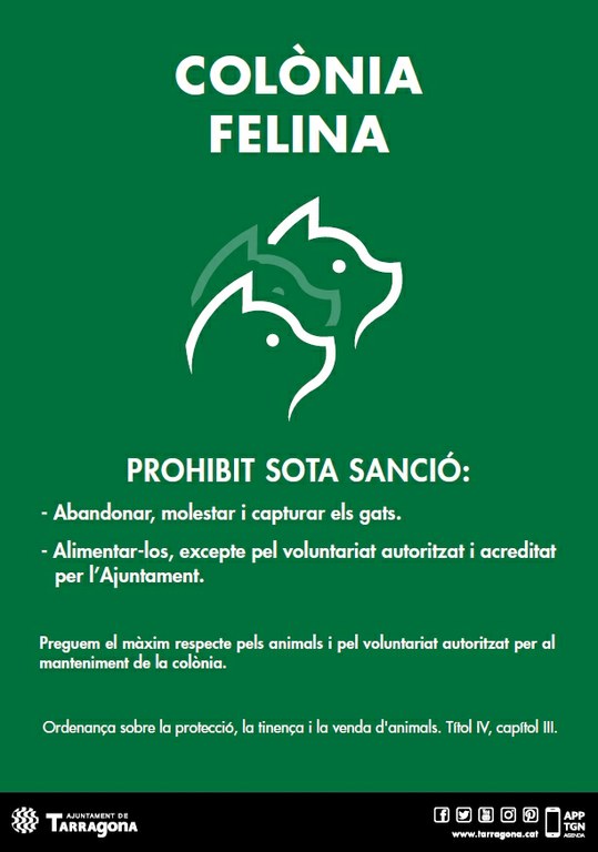 L’Ajuntament de Tarragona condicionarà 16 colònies de gats del municipi en el marc d’una prova pilot. L’eina, inclosa en el projecte de regulació de les colònies de gats ferals, preveu la senyalització de les colònies, la instal·lació d’elements adients per l’alimentació i refugi dels animals i l’esterilització dels seus membres conjuntament amb un control veterinari. Aquest darrer punt inclou el marcatge auricular per identificar els gats ja controlats i la desparasitació externa i interna.