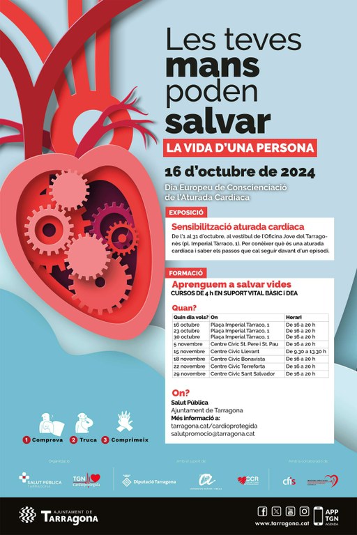 L'Ajuntament de Tarragona oferirà, a partir del pròxim 16 d'octubre i fins al 29 de novembre, cursos gratuïts oberts a tota la ciutadania de Suport Vital Bàsic amb l'ús del desfibril·lador (SBV + DEA). És una de les accions destacades en el marc del projecte Tarragona Cardioprotegida que organitza la conselleria de Salut Pública i que s'inclou en la campanya amb motiu del Dia Europeu de la Conscienciació sobre l'Aturada Cardiorespiratòria (el 16 d'octubre) que enguany porta per lema Les teves mans poden salvar la vida d'una persona.