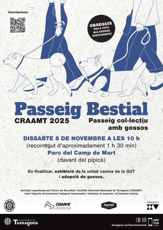 El Centre de Recollida i Acollida d’Animals Municipal de Tarragona (CRAAMT), amb el suport de l’Ajuntament i la conselleria de Benestar Animal; ha organitzat una activitat lúdica, familiar i solidària el proper dissabte 8 de novembre; amb l’objectiu de promoure l’adopció responsable, fomentar el respecte, així com donar visibilitat als gossos en adopció del centre.