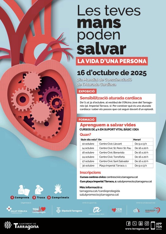 Durant aquest mes d’octubre, el vestíbul de l’Oficina Jove del Tarragonès (a l'antiga Facultat de Lletres de la plaça Imperial Tàrraco), acull una exposició que dona a conèixer què és una aturada cardíaca i explica els passos que cal seguir davant d’un episodi. Aquesta exposició ajuda a integrar les maniobres necessàries per a una bona intervenció davant d’una situació d’emergència.