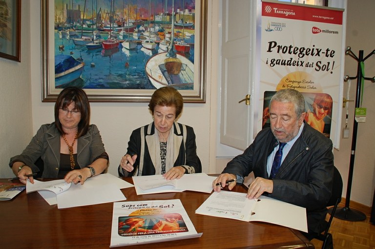 La tinenta d’alcalde de Medi Ambient i Salut, Carme Crespo, la presidenta de l’Associació Espanyola contra el Càncer-Catalunya contra el càncer, junta provincial, Anna Vilallonga, i el president del Col·legi Oficial de Farmacèutics de Tarragona, Andreu Suriol, han signat un conveni de col·laboració per fomentar les activitats de prevenció, informació i conscienciació del càncer.