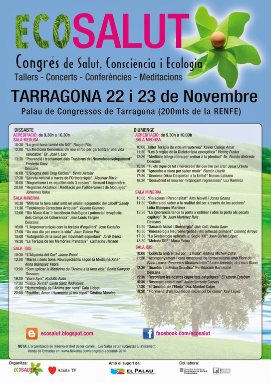 El cap de setmana vinent, 22 i 23 de novembre de 2014, tindrà lloc al Palau Firal i de Congressos de Tarragona el I Congrés Ecosalut: salut, consciència i ecologia, que compta amb un elaborat programa farcit de tallers, conferències, meditacions, etc.