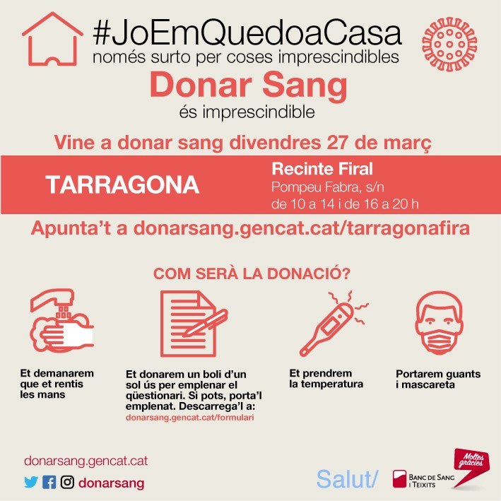 Així doncs, aquest divendres, 27 de març, el Recinte Firal acollirà un espai de donació, de 10 a 14 h i de 16 a 20 h. La campanya substitueix la donació que es fa a Tarragona cada darrer divendres de mes en un autobús davant de l’escola Teresianes.