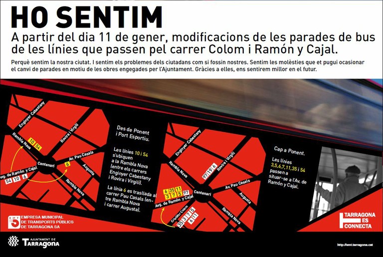 - Totes línies d’autobusos que tenen parada al carrer Colom i que van en direcció sud (Eroski), es traslladen al carrer Ramón y Cajal. Són les següents línies: 3, 5, 6, 7, 11, 35 i 54.