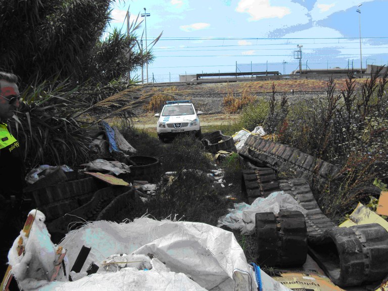 Agents de la Unitat de Medi Ambient de la Guàrdia Urbana van localitzar, quan realitzaven ruta mediambiental per la zona del polígon industrial Entrevies, un abocador incontrolat de deixalles i material industrial, al costat del barranc de Riu Clar, on desemboca el aigua de la Mina dels Tarragonins.