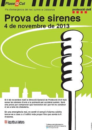 Els Serveis Territorials de Protecció Civil de la Generalitat de Catalunya a Tarragona han comunicat que el dilluns 4 de novembre es realitzarà una prova de so de la xarxa general d'alarmes i comunicacions de protecció civil adscrita al Pla de Sector Químic de Catalunya, PLASEQCAT