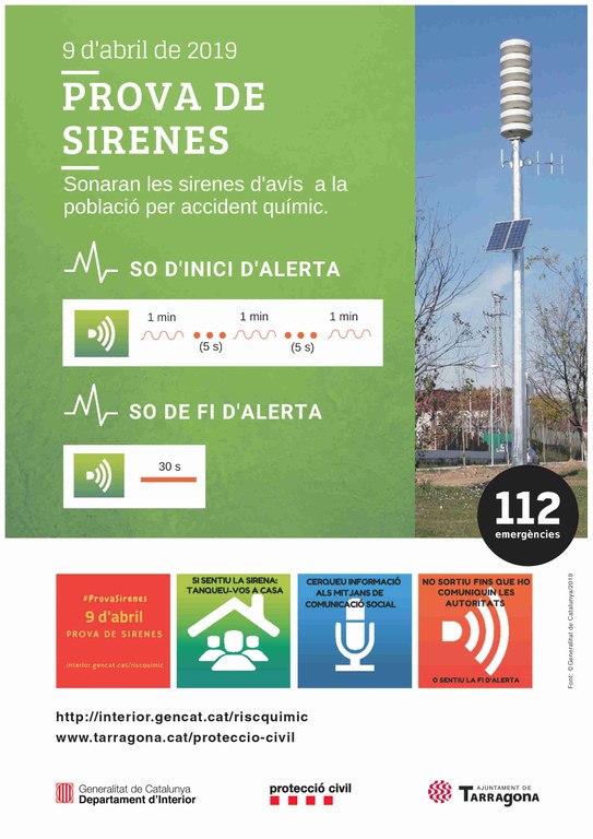 Us comuniquem que la primera prova de sirenes d'avís a la població per risc químic d'enguany es farà avui dimarts, 9 d'abril. Podeu consultar en la pàgina web de Protecció Civil del Departament d'Interior de la Generalitat la informació relativa a aquesta prova, com és la distribució de les sirenes, els horaris d'activació i els consells d'autoprotecció que heu de posar en pràctica en cas de risc químic.