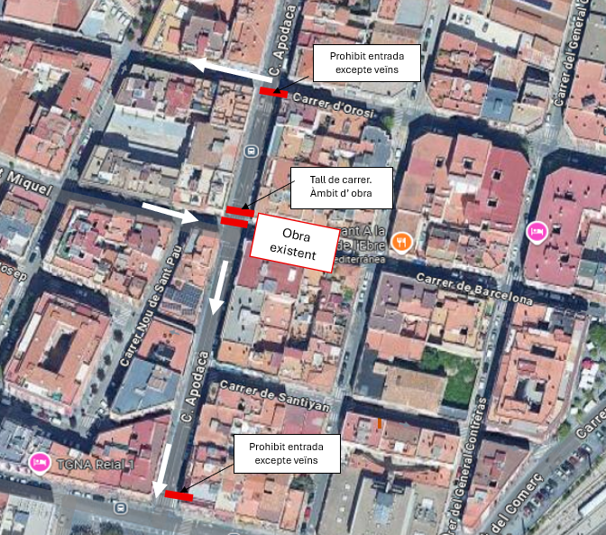 De cara a la setmana que ve, concretament del 28 al 31 d’octubre, les restriccions al trànsit s’estenen al carrer Apodaca. En aquest sentit, durant aquest període de temps, es tallarà completament la circulació de vehicles pel tram entre els carrers Orosi i Barcelona.