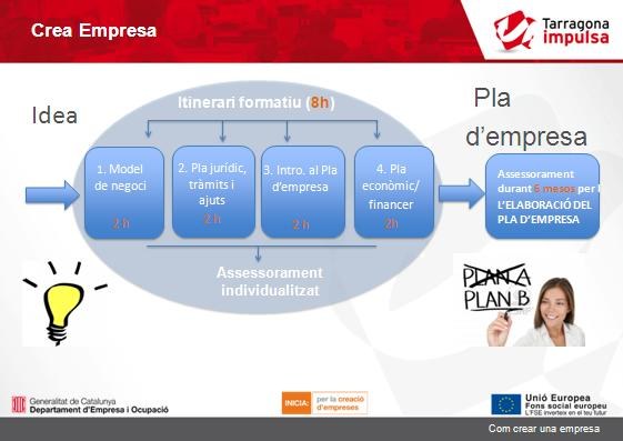Durant aquest mes d'octubre el servei d'empresa i emprenedoria de Tarragona Impulsa ha posat en marxa un nou programa d'assessorament per a emprenedors, el "Crea Empresa" , consisteix en un itinerari formatiu mitjançant el qual s'ofereixen els recursos necessaris per transformar una idea de negoci en una empresa. El programa s'articula en un itinerari de 4 sessions formatives de 2 hores cadascuna: