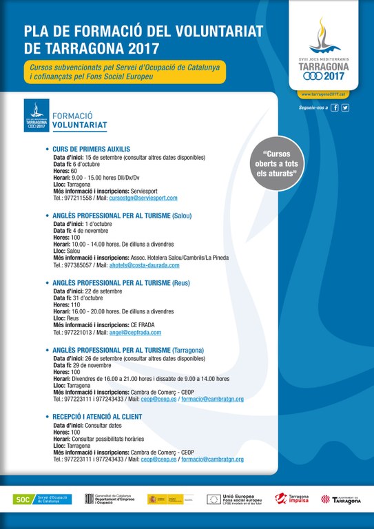 Els XVIII Jocs Mediterranis Tarragona 2017 i Tarragona Impulsa, amb la col·laboració del Servei d’Ocupació de Catalunya, van posar en funcionament el passat mes d’agost un Pla de Formació del Voluntariat 2017 en el qual s’imparteixen matèries d’interès general que, a banda de millorar les competències i habilitats dels voluntaris dels Jocs, estan obertes també a totes les persones que actualment es trobin en situació d’atur, siguin o no voluntàries. Totes aquestes activitats formatives estan subvencionades.