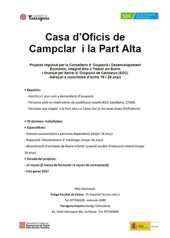 - Tarragona Impulsa - Antiga Facultat de Lletres - Pl. Imperial Tarraco núm 1 Tel: 977296100 - extensió: 6389