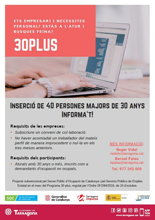 Les persones i empreses interessades a participar en el Programa 30 Plus es poden adreçar a Tarragona Impulsa av. Vidal i Barraquer, s/n M1, telèfon 977 243 609, correus rvidals@tarragona.cat i bpalau@tarragona.cat