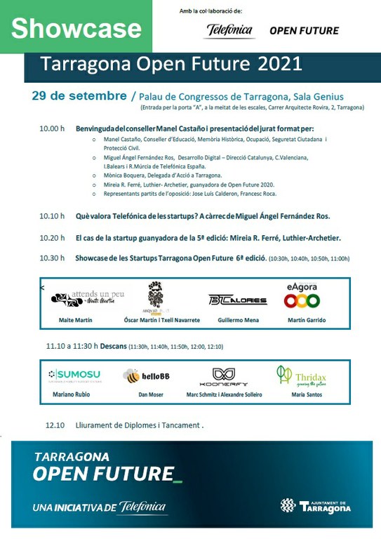A les 10 del matí el conseller d’Ocupació, Manel Castaño, inaugurarà la jornada amb un parlament de benvinguda i la presentació dels membres del jurat d’aquesta 6a edició. El jurat estarà format: pel mateix Castaño, Miguel Ángel Fernandez, desenvolupament digital a la direcció de Catalunya, C. Valenciana, I. Balears i R. Múrcia de Telefónica Espanya; Mònica Boquera, delegada d’Acció a Tarragona; Mireia R. Ferré, luthier i archetier, guanyadora de l’Open Future 2020 i tres representants dels grups municipals: Berni Álvarez (PSC), Elisa Vedrina (PP) i el Jose Luís Calderón, no adscrit.