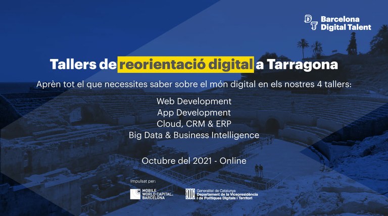 El proper 19 d’octubre a les 16 h se celebrarà el primer dels quatre tallers de reorientació digital organitzats des de l’Ajuntament de Tarragona a través de Tarragona Impulsa amb la col·laboració de Barcelona Digital Talent. Es tracta de sessions en línia dirigides als professionals de la ciutat amb l'objectiu que coneguin les oportunitats del sector tecnològic i impulsar la introducció de nous professionals al mercat.