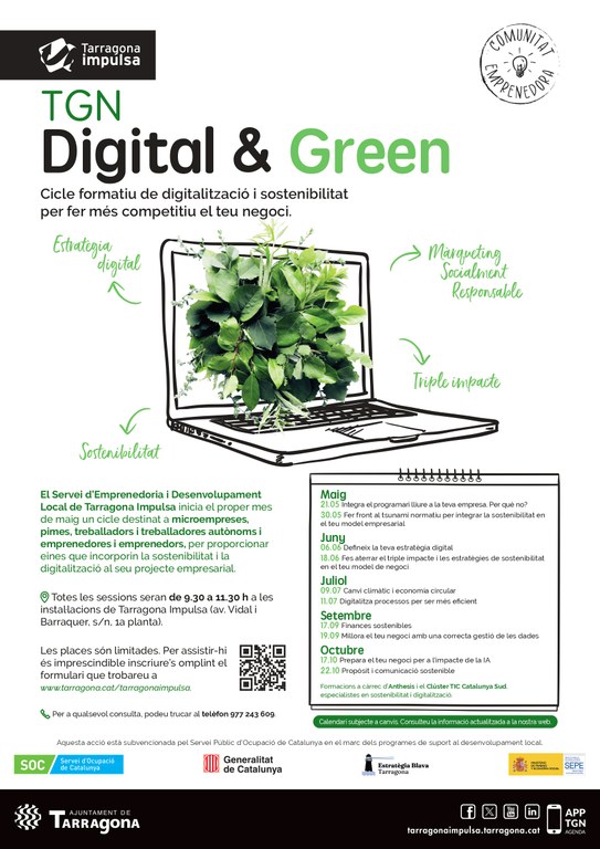 En conjunt, el programa vol ser un espai de formació de referència sobre les qüestions al voltant de la responsabilitat social corporativa, la sostenibilitat i la digitalització que afecten el món de l’empresa i l’emprenedoria. L’accés és gratuït, amb inscripció prèvia a cada ponència a https://www.tarragona.cat/tarragonaimpulsa/formacio/cicle-tgn-digital-green.