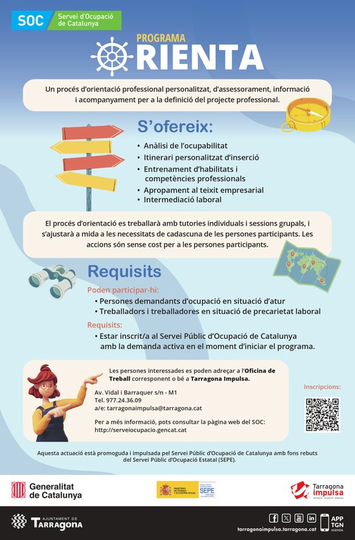 Tarragona Impulsa ofereix el Programa Orienta, un servei totalment gratuït i personalitzat d’orientació professional, assessorament, informació i acompanyament per a la definició del projecte professional de l’usuari. El programa està adreçat a persones treballadores demandants d’ocupació a l’atur o bé que es trobin en situació de precarietat laboral.